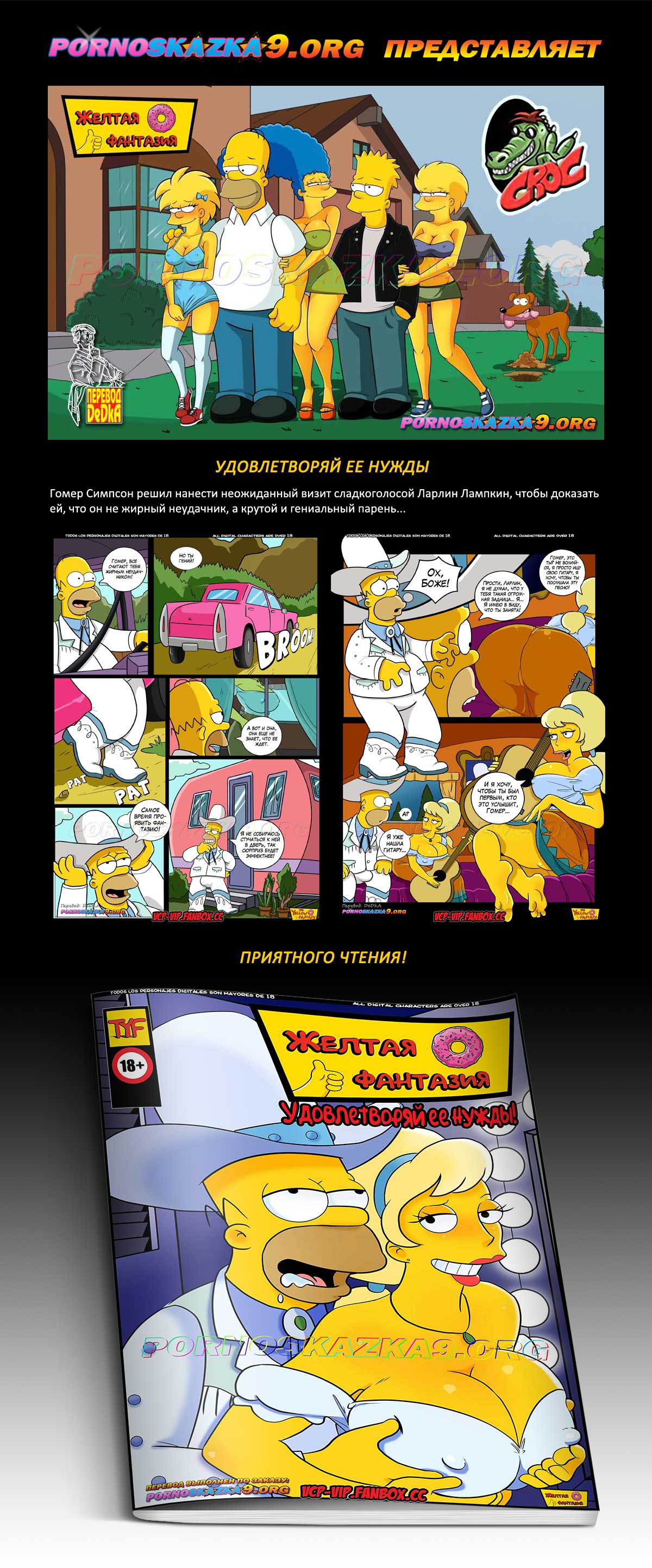 Порно комикс «Удовлетворяй ее нужды.» Гомер Симпсон решил нанести неожиданный визит сладкоголосой Ларлин Лампкин, чтобы доказать ей, что он не жирный неудачник, а крутой и гениальный парень…